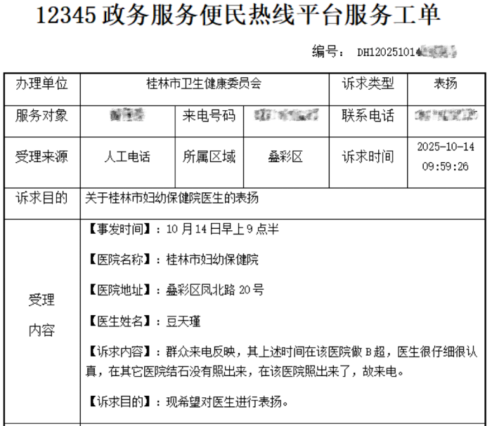 近日,桂林市妇幼保健院超声医学科收到了一份特殊的“肯定”——市民韦女士(化名)通过12345政务服务便民热线,专门表扬超声医学科医师在检查中细致负责,及时发现潜在健康隐患,用专业与耐心为群众健康筑起“防护墙”。